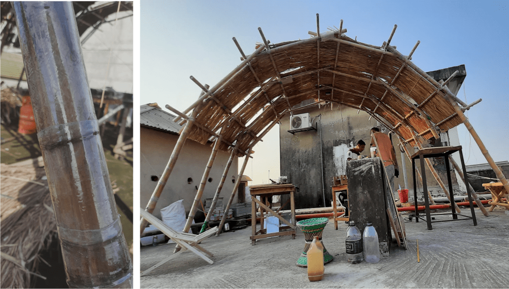 1- A self-supporting arched structure serving as a shade, situated in Cox’s Bazar, depicted immediately after construction in January 2021. This structure, fully exposed to the elements, including direct sunlight and rain, stands as a testament to the initial application and potential resilience of the laminating bamboo technology.