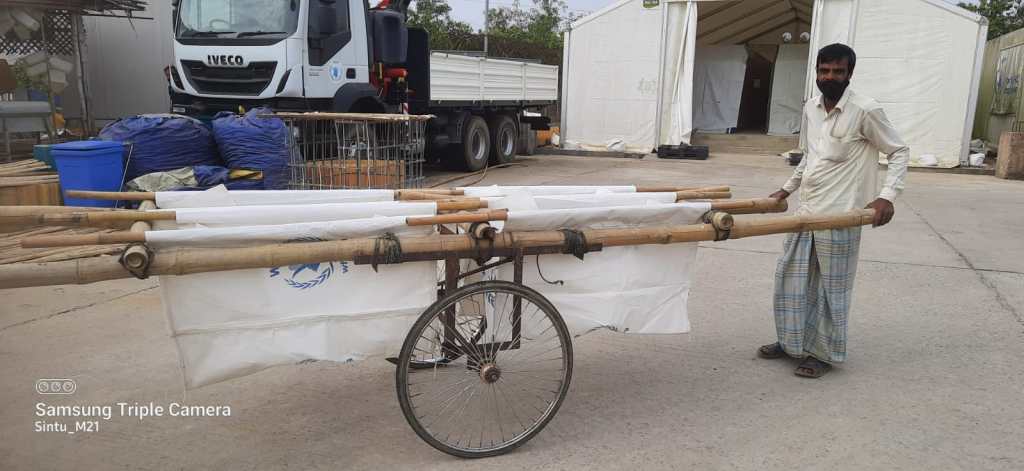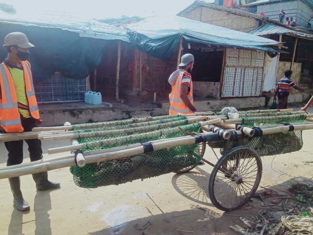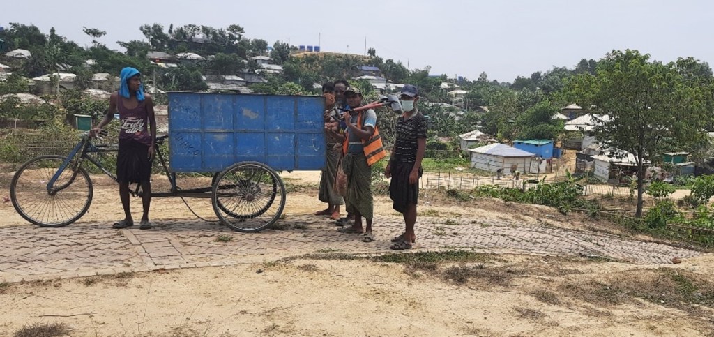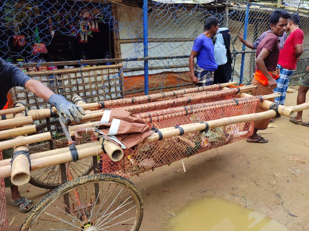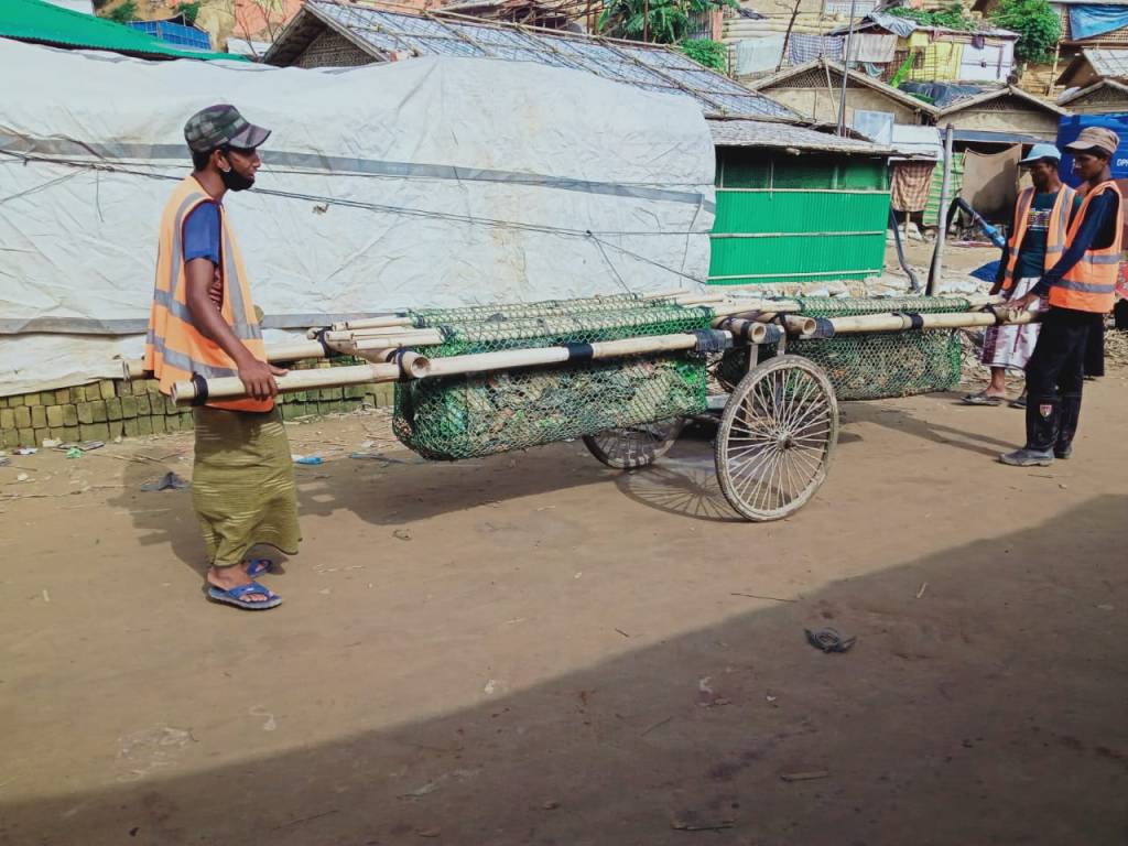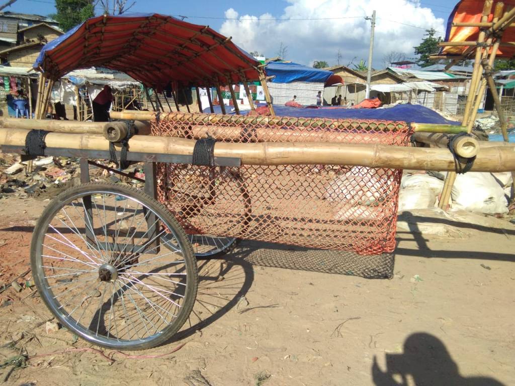 The currently used in the camps, the modified rickshaw bicycle carts made of steel, or the construction tradetional pushing carts are very commonly used in Bangladesh, they are suitable for horizontal landscape, flet roads and very unsuitable for the hilly environment such the on in the camps.
